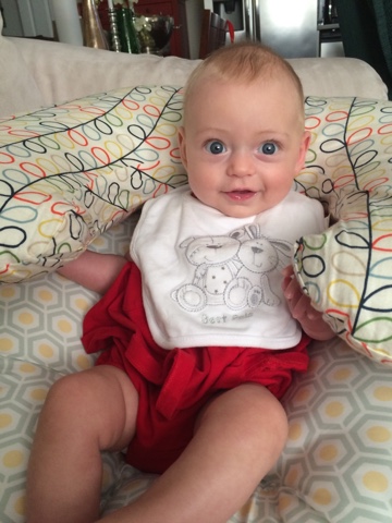 Every day with you keeps getting better and better! You are laughing so much these days and are such a delight to be around. You wake up with the biggest smile on your face and are even starting to recognize mommy and daddy's voices when we walk in the room. Your snuggles are the best, giving big hugs when we pick you up. You love sitting up and being able to look around at what's going on, so your frog seat from Auntie Meg has been your new favorite lounger this month. You've developed quite the grip these days, holding onto your Daddy's finger, WubbaNub, rattle, Sophie, or mommy's hair. We are happy to report you are filling out 3-6 month clothes and 6 month footie pj's. You have started sleeping longer and longer each night, and now usually sleep anywhere from 8-10 hours, with a couple of naps during the day. You also have gradually started taking down more milk in the bottle this month (4oz) and reducing your number of feedings to 6-7 in a day. Time with Mimi has been great and mommy enjoys coming to visit during her day to nurse. The most exciting thing this month has been your laughter and giggles--you are such a joy! You loved your first trip to the beach and meeting all your Mango's. We also had a special visit with GranDe's family, and you got to meet your Great Grandmother and Grandpa. We also celebrated your baptism, surrounded by family and friends, and it was such a special day. We chose your Auntie Meg as your God-momma and your Uncle Rob as your God-pappa, giving you a good mix of old Virginia and South Alabama. :)