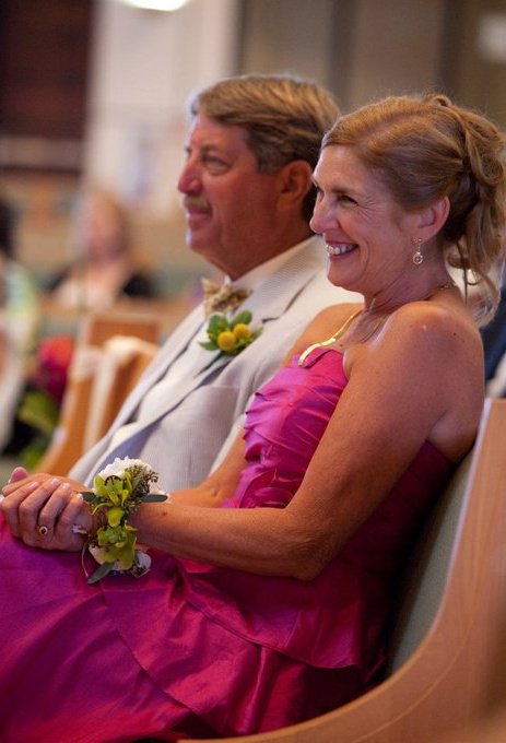 Mom wore a beautiful simple white dress hand made by my grandmother herself. With a full length lace veil borrowed from Aunt Sissy. The ten bridesmaids wore a rainbow of colorful dresses, 2 blue, 2 pink, 2 yellow, 2 green and 2 purple. Off the shoulder with a ruffle top - who knew my mom was so stylish?